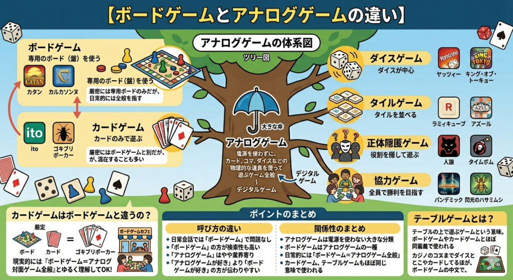 「ボードゲーム」「アナログゲーム」「カードゲーム」「テーブルゲーム」——最近よく耳にするこれらの言葉、実はどれも似ているようで微妙に意味が違います。